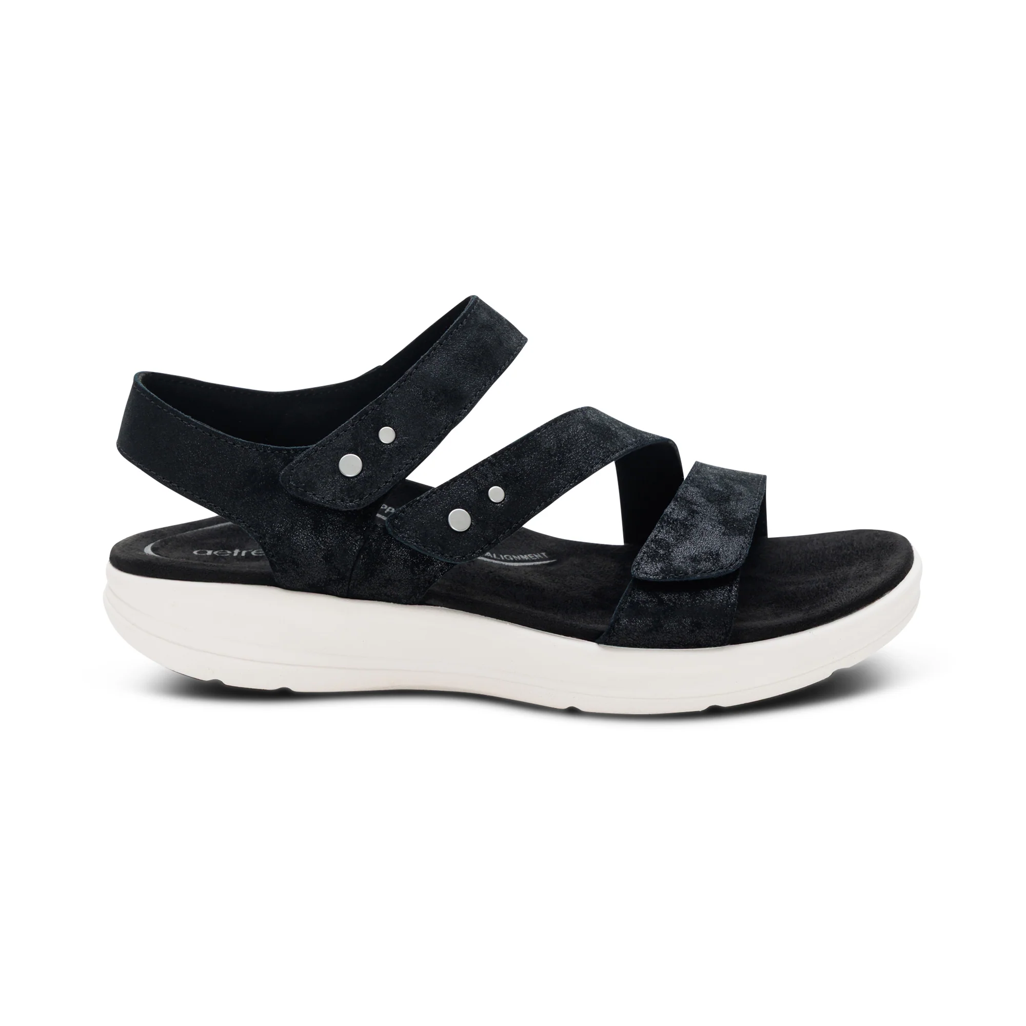 Experience next-level comfort with Savannah, a fully adjustable quarter-strap sandal, designed with innovative BioRocker™ Technology for a natural, effortless stride. Hook & loop provide a secure, customized fit, while the premium leather upper adds durability and style. The EVA midsole and rubber outsole deliver lightweight support and traction. The SkyTech™ microfiber-wrapped footbed, cobra heel pressure relief, and raised met-pad cushion offer targeted comfort and all-day cushioning. Each Aetrex shoe is anatomically designed based on data and learnings from over 50 million global foot scans. This ensures you’re getting the best fit for your feet and premium support for your body from the ground up.